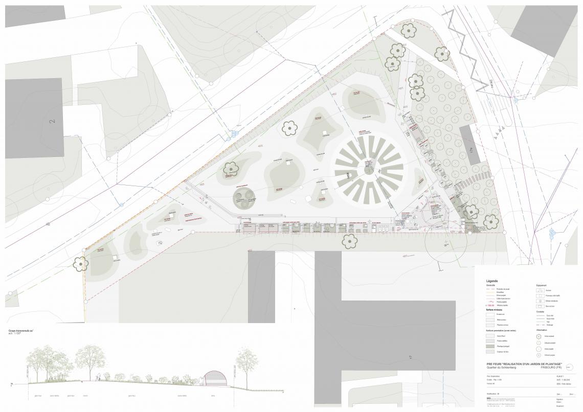 Der mit der Bewirtschaftung des Gartens beauftrage Bereich des Gesellschaftlichen Zusammenhalts hat im Rahmen seines Programms Bildungslandschaft im Schönberg vorerst eine Arbeitsgruppe mit den Bewohnern des Quartiers, den Animatorinnen des Projekts Couleur Jardin des Freiburgischen Roten Kreuzes, dem Zentrum für soziokulturelle Animation REPER und den Landschaftsarchitekten von MG associés Sàrl, die für die Gestaltung des Gartens zuständig sind, gebildet, um einen Arbeitsrahmen zu schaffen. Das Mandat für die Verwaltung des Gartens wurde dem Verein REPER erteilt, der zu diesem Zweck eine soziokulturelle Animatorin (40%) angestellt hat. Das Projekt wird nun im Einklang mit den Erwartungen der Bevölkerung entwickelt.