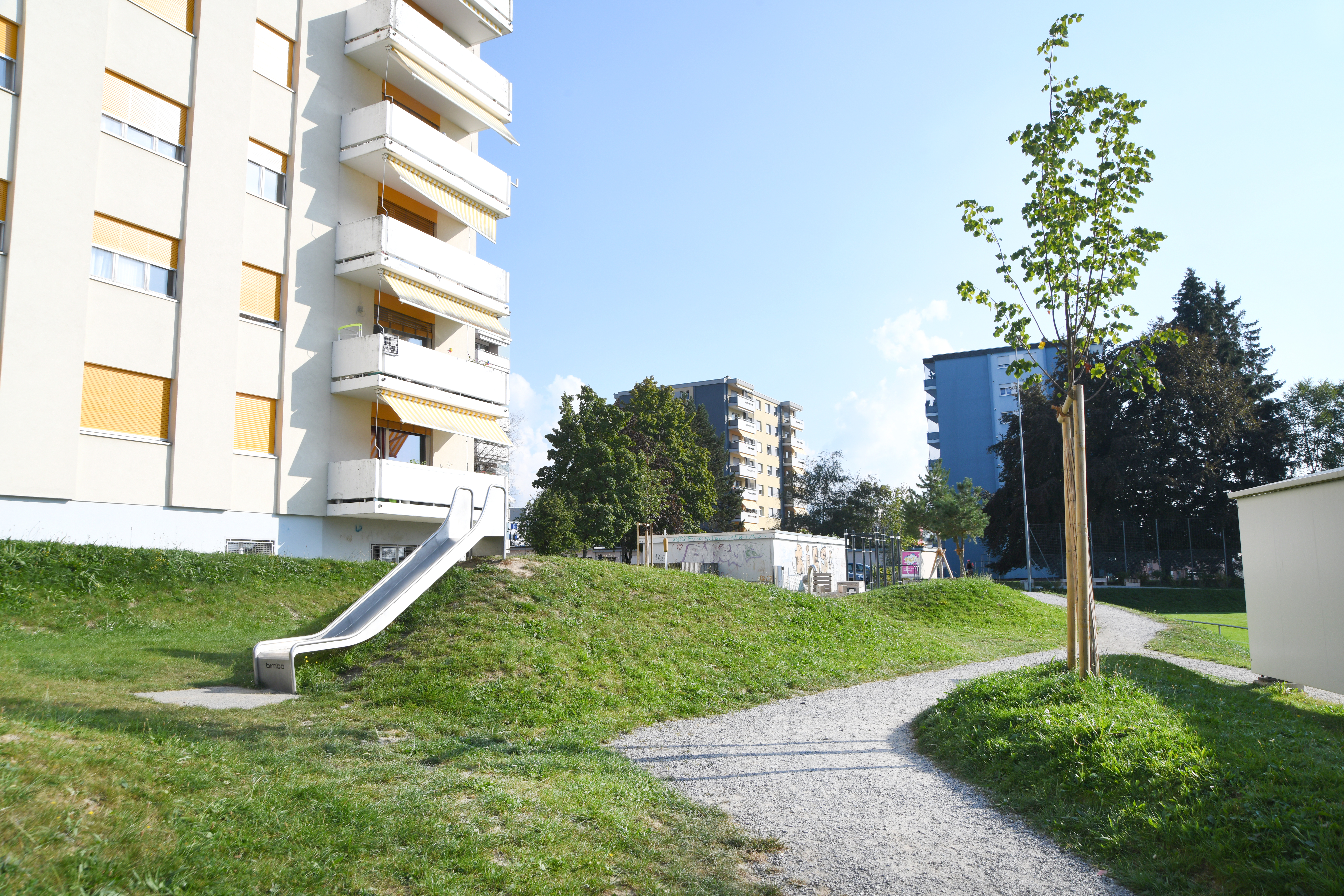 Das Gelände rund um das Fussballfeld wurde in Form von kleinen Hügeln mit Spielgeräten (Schaukel, Karussell, Rutschbahn, Sandkasten usw.) sowie einer Street-Workout-Anlage neu gestaltet. Ein Weg führt durch die Hügel und um den Fussballplatz herum. Er wird von kleinen Plätzen umrahmt, auf denen sich die Nutzerinnen und Nutzer ausruhen können, Bäume spenden ihnen dabei Schatten. Überdies wird der Freiburger Künstler Robin Brändli 2021 gemeinsam mit Jugendlichen und in Zusammenarbeit mit REPER ein Wandfresko realisieren, um den Ort einladend zu gestalten.