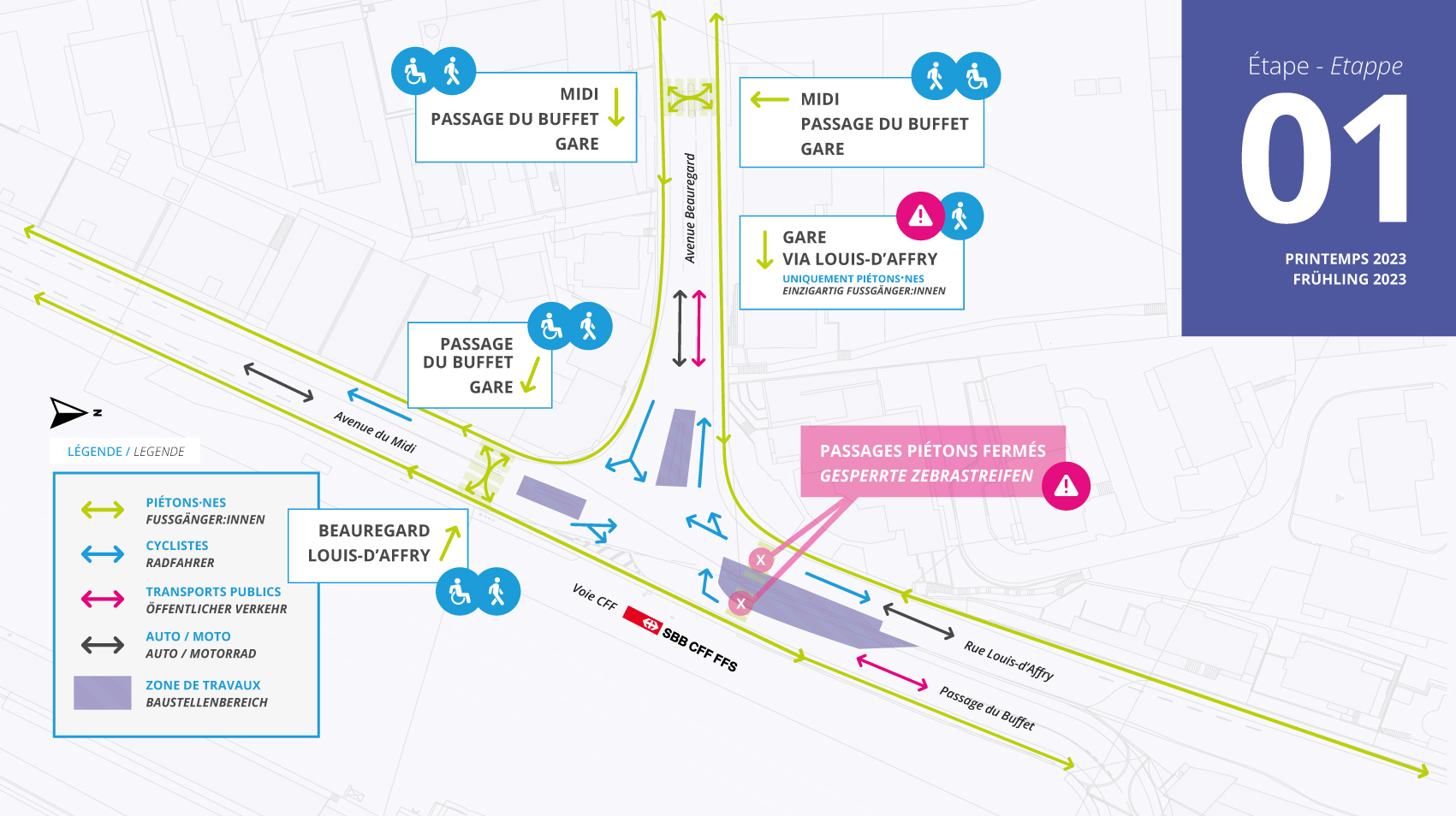 Das Raumkonzept dieses Projekts ermöglicht es, den Verkehr flüssiger zu gestalten, den für die Zugänge der künftigen Unterführung erforderlichen Raum zu schaffen, aber auch den Langsamverkehr zu fördern, indem insbesondere dem Umstand Rechnung getragen wird, dass künftig die TransAgglo die Kreuzung durchqueren wird.