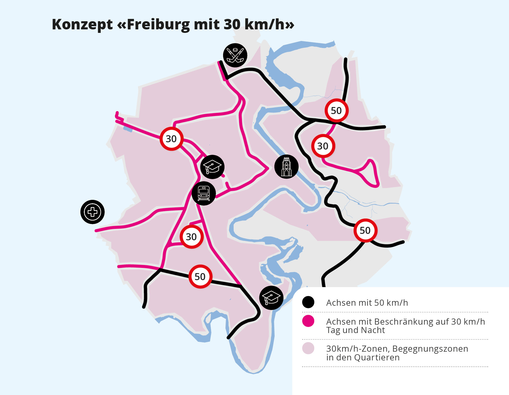 In den geeigneten Quartieren hat die Stadt Freiburg eine Reihe von Tempo-30-Zonen eingerichtet und wird diese auch weiterhin ausbauen. In diesen Zonen gelten spezielle Regeln: Rechtsvortritt an Kreuzungen, Wegfall von Fussgängerstreifen. Auf einigen Hauptverkehrsadern wird die Geschwindigkeit zwar auf 30 km/h begrenzt, dort gelten jedoch auch weiterhin die normalen Verkehrsregeln.