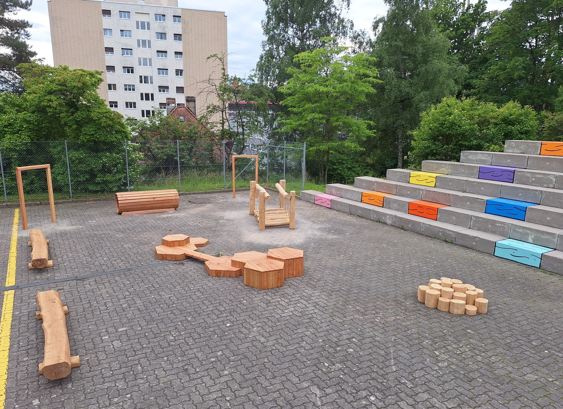 Für Kinder im Alter von 1 bis 2 Jahren wurde bis zur Renovierung der Schule ein temporärer Spielplatz eingerichtet. Paysage éducatif hat bei der Konzeption dieser provisorischen Lösung mit mehreren Dienststellen der Stadt Freiburg zusammengearbeitet. Das Waldzentrum des Burgergemeinde wurde mit der Herstellung von Holzspielgeräten in Form eines Parcours beauftragt.