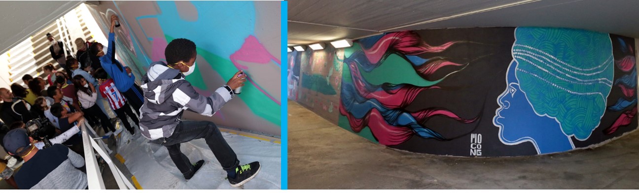 Konzipiert wurde dieses partizipative Graffito nach dem Bau des Skate-Parks auf dem Schulgelände. Dieses neue Spielfeld befindet sich unmittelbar neben einem Schulhof, dessen Mauern von wilden Graffiti überzogen waren. Die Fläche ist nun mit schönen Farben, mit dem Namen der Schule und mit getaggten Umrissen der beteiligten Schülerinnen und Schülern bedeckt.
