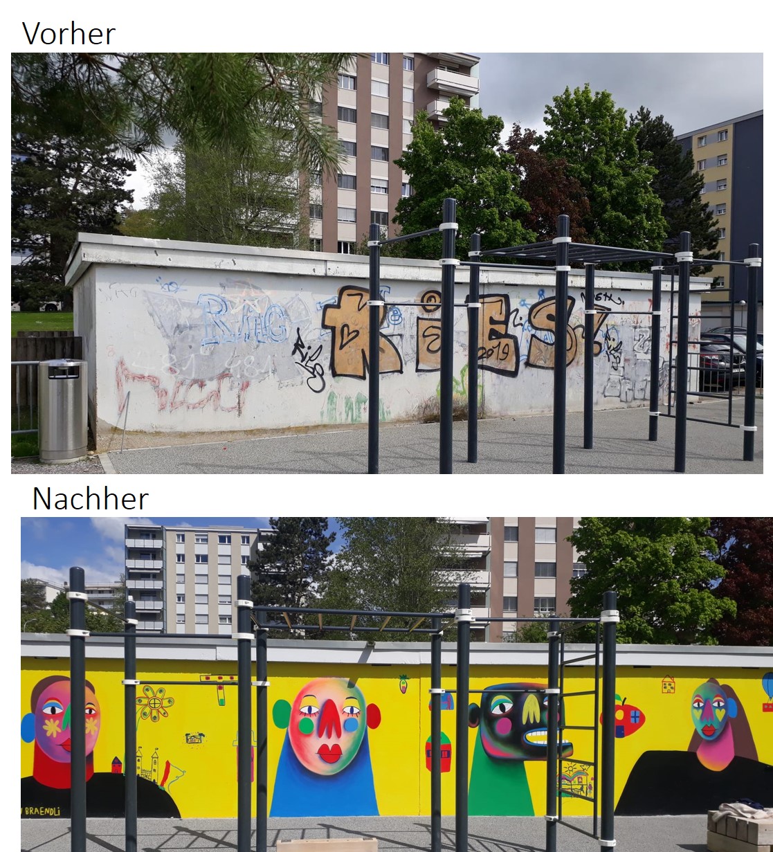 Im Rahmen des Projekts Freiraum Freiburg schaffte der Künstler Robin Braendli im Mai 2021 eine Freske in Zusammenarbeit mit Kindern, die zuvor an Workshops über Street Art teilgenommen hatten. Während dieser Workshops hatten die jungen Teilnehmer·innen die Gelegenheit, ihr Traumhaus auf Papier zum Leben zu erwecken. Anschliessend haben sie dann ihre Zeichnungen auf der Mauer um das Fussballfeld vom Schönberg reproduziert.