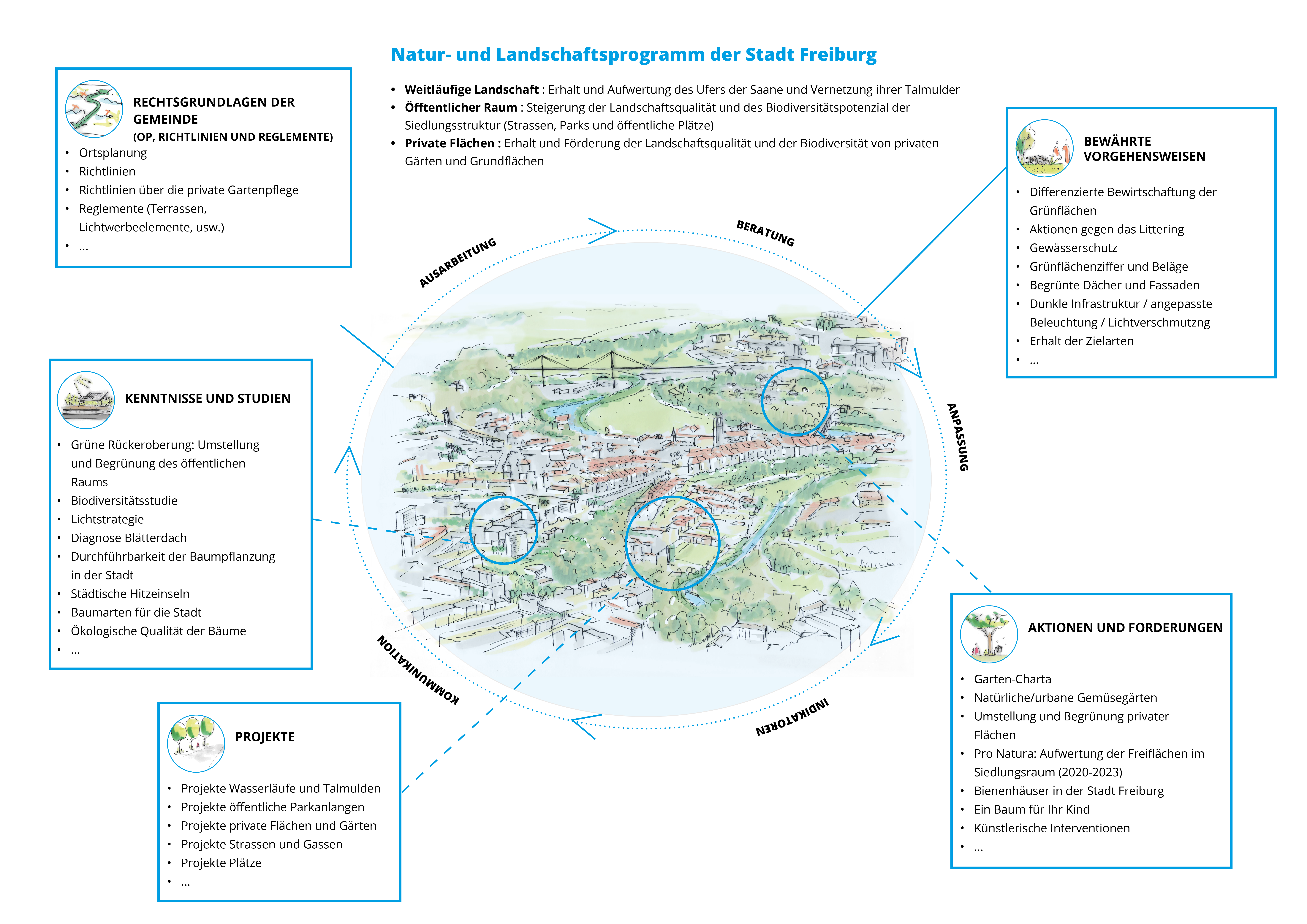 Das Natur- und Landschaftsprogramm umfasst rund fünfzig mittel- und langfristig geplante Massnahmen und Studien zur Förderung der Biodiversität. Darunter finden sich beispielsweise Massnahmen zugunsten der Fauna und Flora, Anreize, sich für die Biodiversität einzusetzen, Projekte für eine grüne Rückeroberung oder die Revitalisierung der Saane.