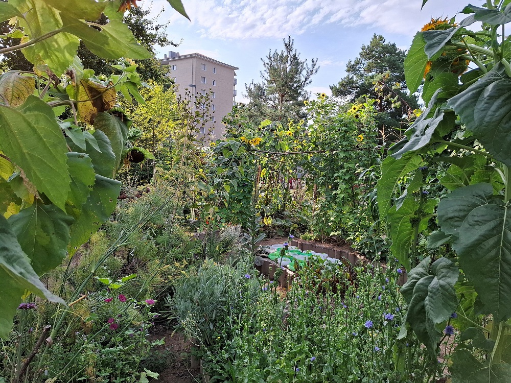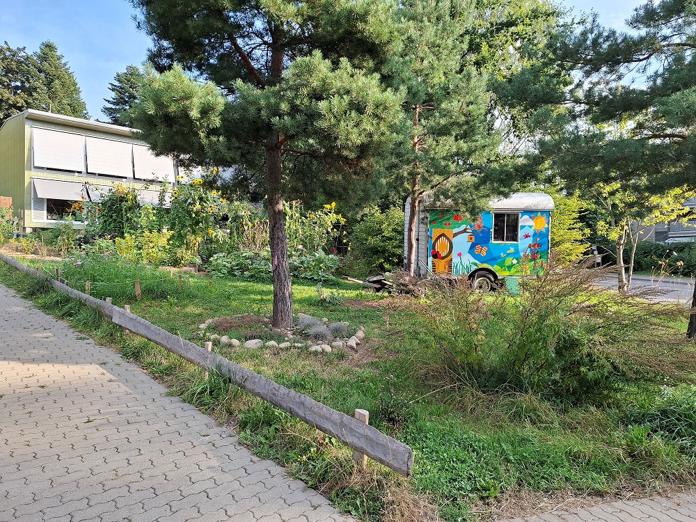 Wie im Gemeinschaftsgarten Préfleuri werden in einem Bereich Früchte und Gemüse nach den Grundsätzen der Permakultur angebaut (Mulchen, Oyas, Kompost). In diesem Bereich wird eine differenzierte Pflege befolgt, die sich beispielsweise in der herrlichen Blumenwiese widerspiegelt. Diese fördert die Biodiversität und zieht Nützlinge an, von denen wiederum der Garten profitiert (z.B. Wildbienen und Marienkäfer).