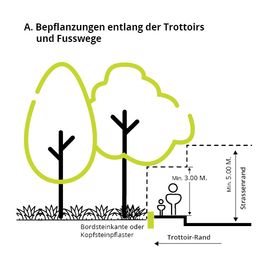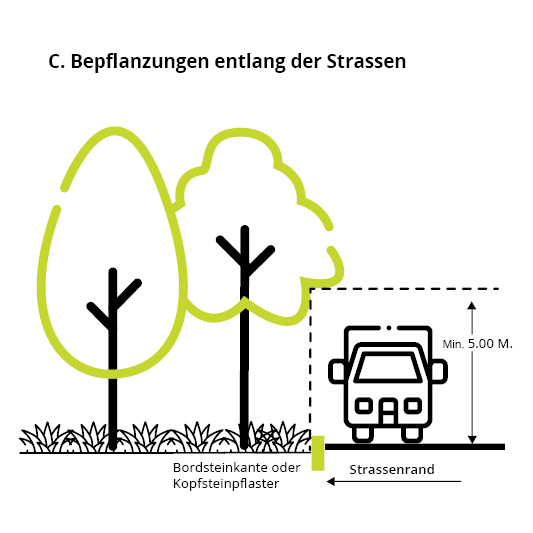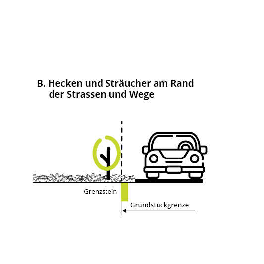 Alle Äste von Bäumen oder Sträuchern, die über den Rand einer Route der sanften Mobilität oder eines Trottoirs hinausragen, bis zu einer Höhe von 3 m über dem Boden beschnitten werden. Zudem sind alle Äste, die über den Fahrbahnrand einer Strasse hinausragen, bis zu einer Höhe von 4,5 m ab Fahrbahn zu entfernen (Art. 135 Abs. 1 MobG). Dies gilt auch für jegliche Vegetation, die Verkehrszeichen, Straßenbeleuchtung und die Sichtbarkeit an Kreuzungen und Zufahrten beeinträchtigt.