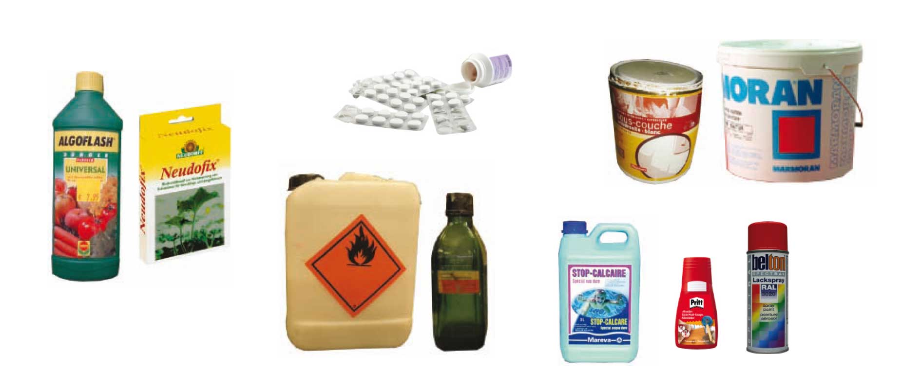 - Produits ménagers: détergent, produits de nettoyage, anticalcaire, sprays contentant des liquides, colles, etc.