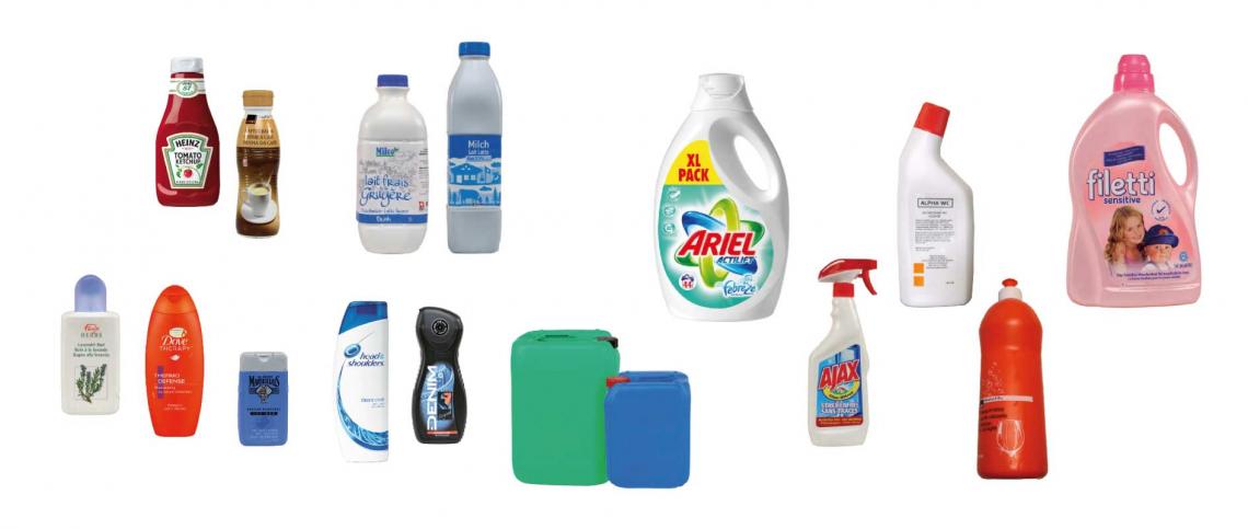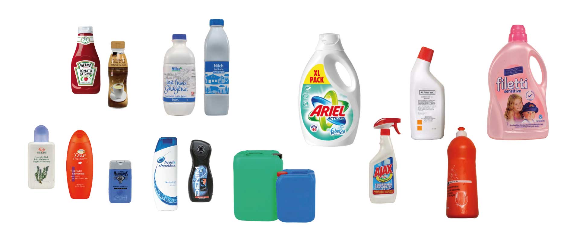 - Bouteilles de produits de nettoyage, lessive, lait, shampooing, etc.