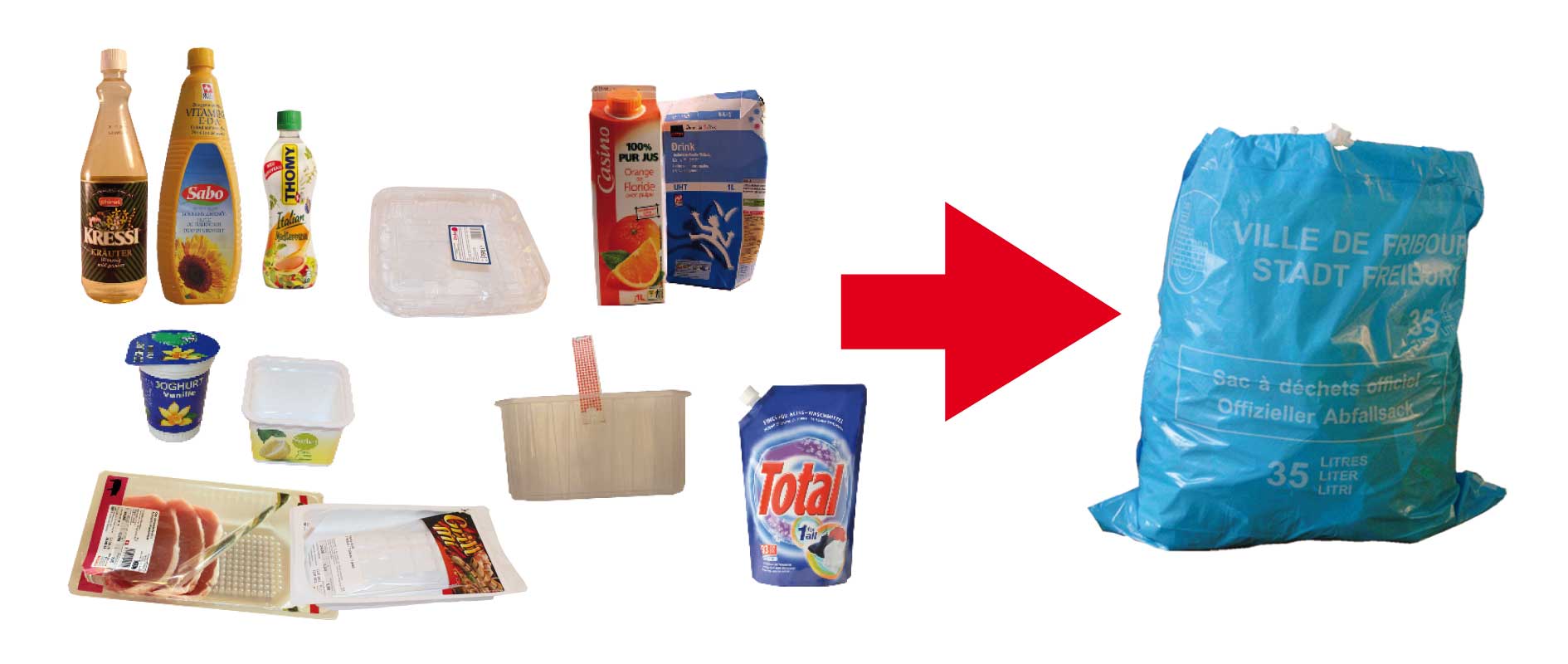 - Le plastique non recyclable est à éliminer dans les sacs officiels bleus avec les ordures ménagères.