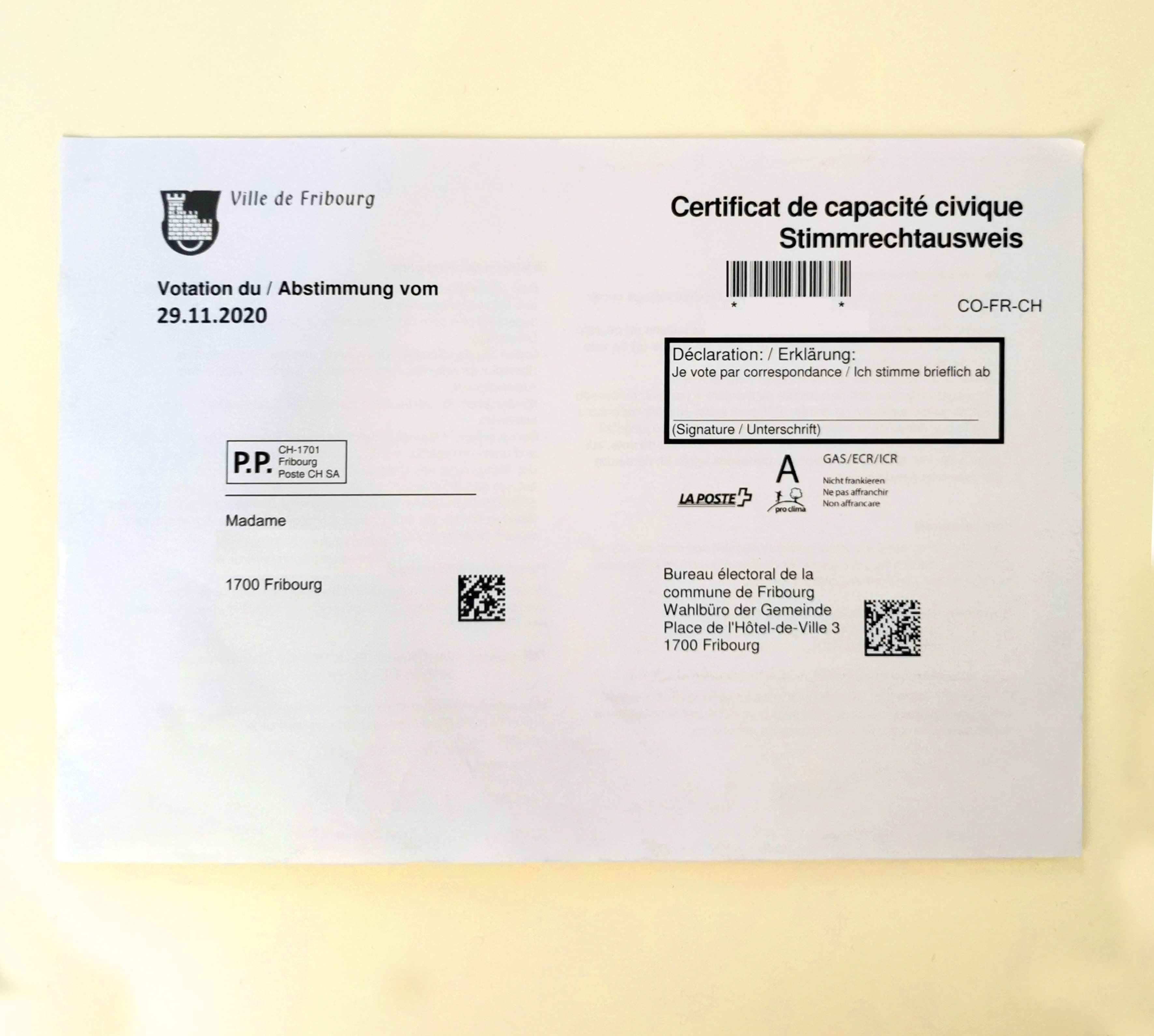 Le certificat de capacité civique (feuille blanche au format A5) doit impérativement être signé et inséré dans l’enveloppe-réponse ou emporté avec vous au bureau de vote. Il sert à prouver que vous pouvez exercer votre droit de vote en ville de Fribourg.