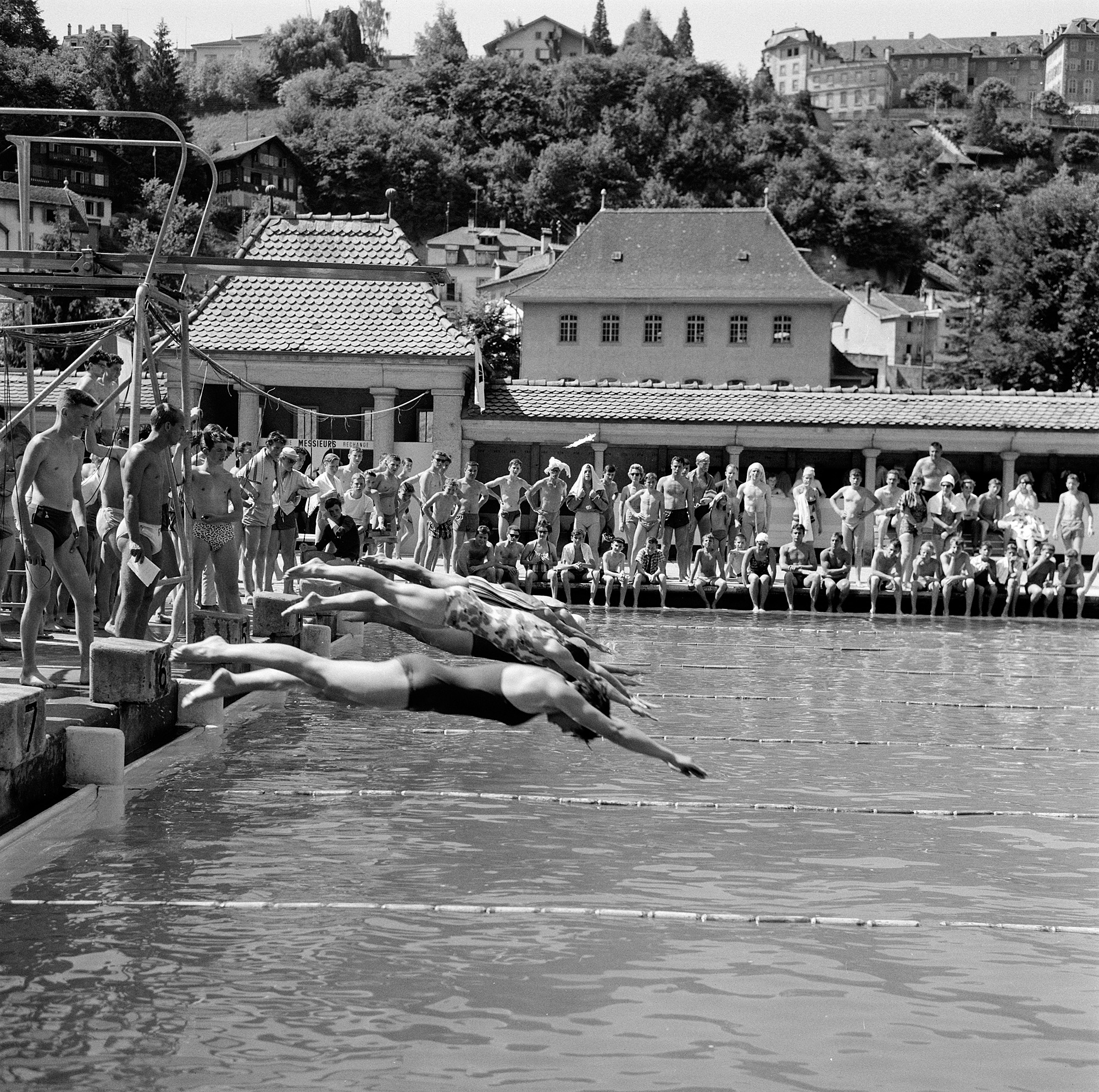 Bains de la Motta, épreuves de natation de la fête scolaire (Kinderfest) (1960) - ©Bibliothèque cantonale et universitaire de Fribourg, Fonds Johann et Jean Mülhauser