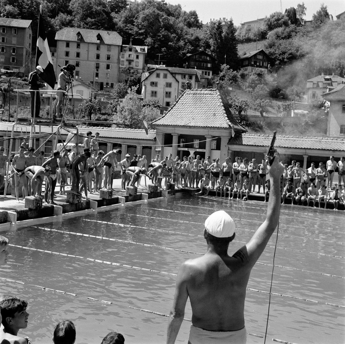 Épreuves sportives aux Bains de la Motta (entre 1970 et 1984) - ©Bibliothèque cantonale et universitaire de Fribourg, Fonds Leo et Micheline Hibert