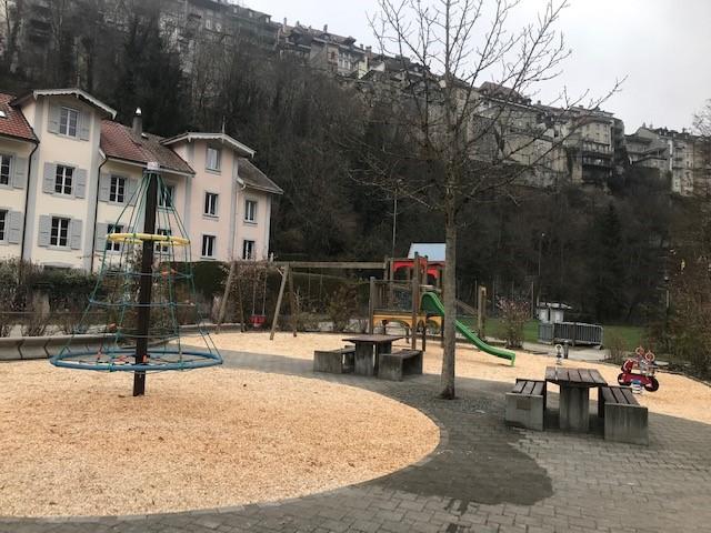 Adjacente à la cour de l’école de la Neuveville, cette place de jeux dispose d’engins classiques destinés aux jeunes enfants. L’espace vert et le terrain de basket avoisinants offrent des activités complémentaires, notamment pour les plus grands.