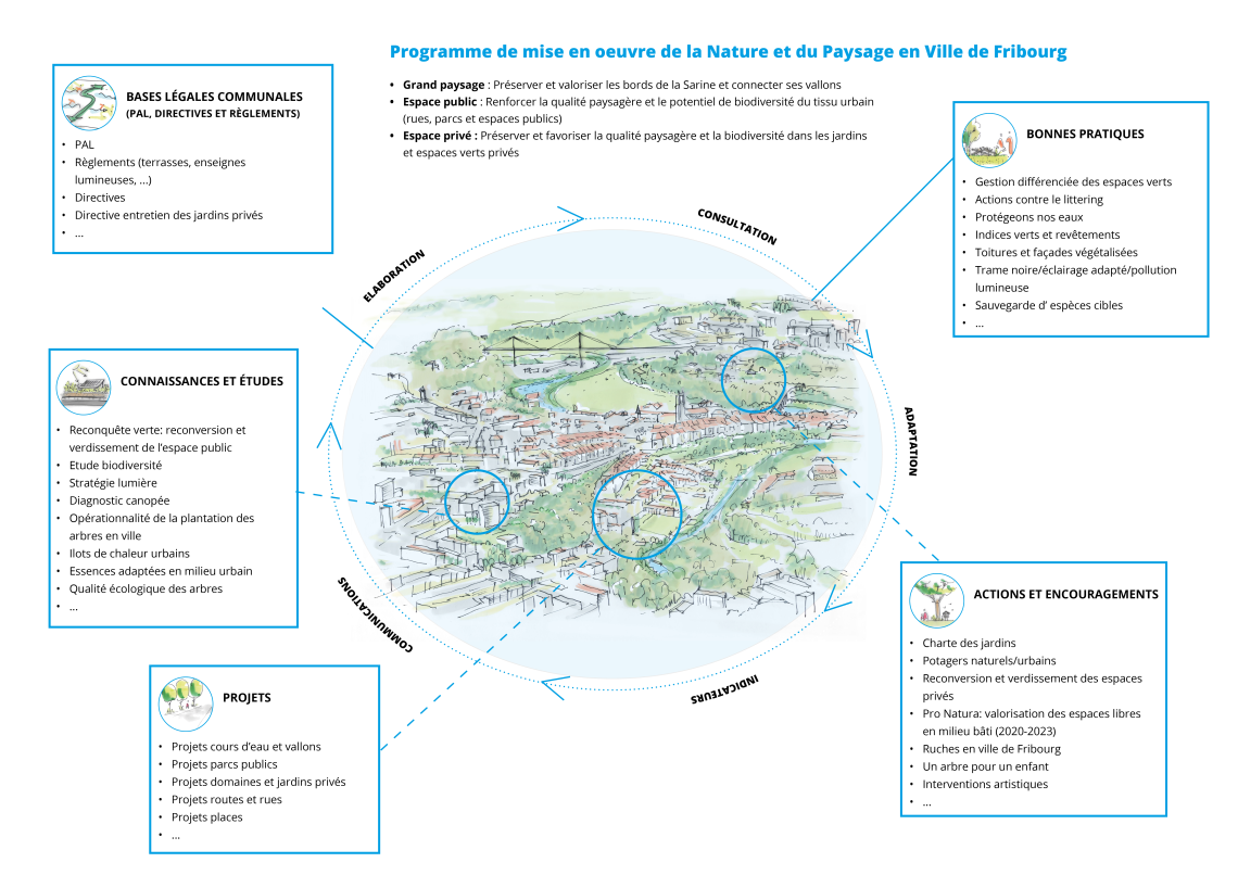 Le programme Nature et paysage (PNP) regroupe une cinquantaine d'actions et d'études en faveur de la biodiversité, planifiées à moyen et long terme. On y trouve par exemple des mesures pour la faune et la flore indigène, des incitations à se mobiliser pour la biodiversité, des projets de reconquête verte ou la revitalisation de la Sarine.