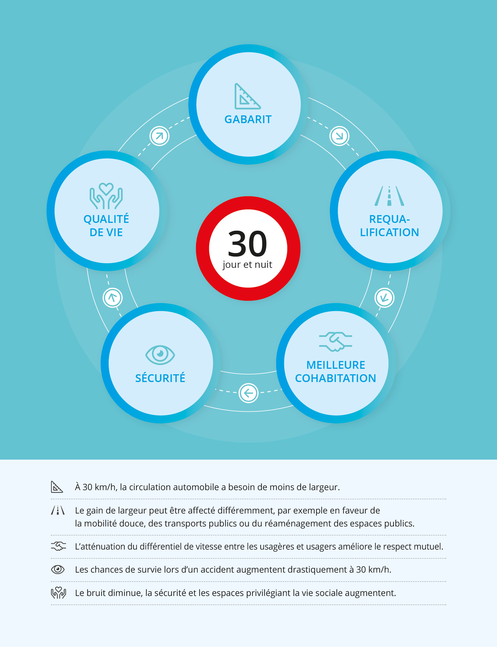 A 30 km/h, la circulation routière a besoin de moins de largeur. La place gagnée peut être réaffectée pour la mobilité douce, les transports publics, les espaces publics et permet des réaménagements.