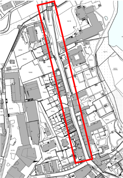 Direction sortie de Ville : traçage d’une bande cyclable continue depuis le bâtiment n°22 jusqu’à la porte de Morat; pour des questions de gabarit, il n’est pas possible de débuter le traçage de cette bande cyclable depuis le giratoire du bas du Varis.