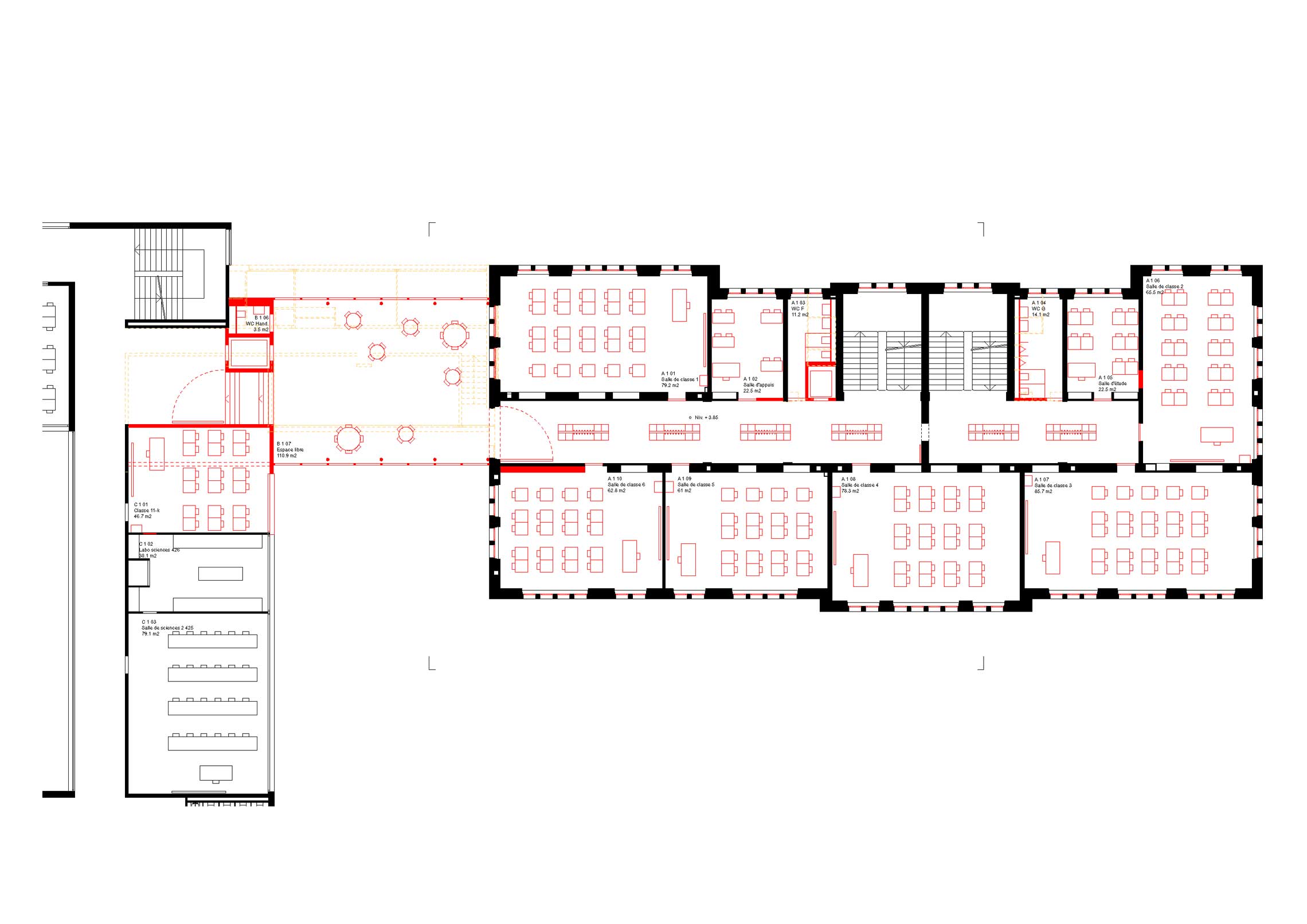 La nouvelle liaison accueille de nouveaux espaces dédiés aux élèves et aux professeurs. Ces locaux sont indispensables pour un bon fonctionnement et un climat d’étude optimal. La situation centrale de ces locaux apporte une fluidité dans les déplacements des élèves et des professeurs.