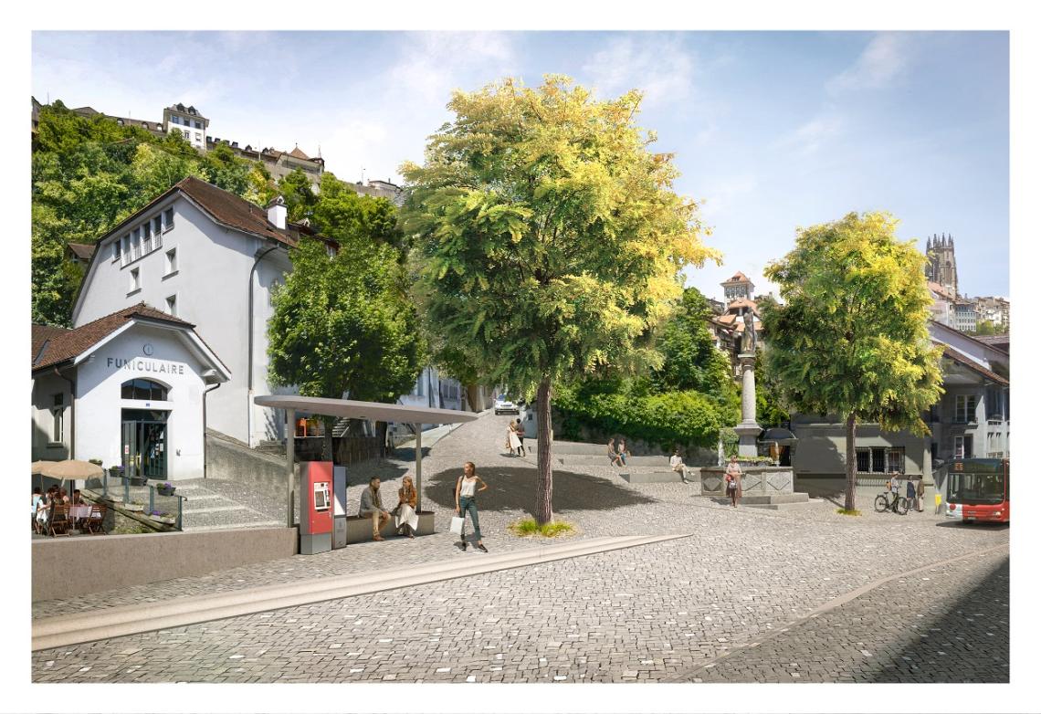 La fontaine du Sauvage sera positionné au centre de la place. A ses côtés, un aménagement en gradins dans la partie supérieure de la pente débouchera sur un petit plan d'eau à fleur de sol. Une connexion plus directe entre le funiculaire et le chemin des Bains sera construit. Les arrêts de bus seront déplacés dans la partie la moins escarpée de route afin de faciliter l'accès aux véhicules des TPF. Un couvert avec une assise et le distributeur de tickets permettra l'attente du bus dans des conditions agréables ou invitera à la détente. L'aire d'arrivée du funiculaire deviendra un véritable espace d'accueil et les restaurants profiteront de terrasses. De nouveaux arbres marqueront l'entrée dans la zone de rencontre côté Route-Neuve et seront des points d'ombre bienvenus sur une surface qui restera essentiellement minérale.