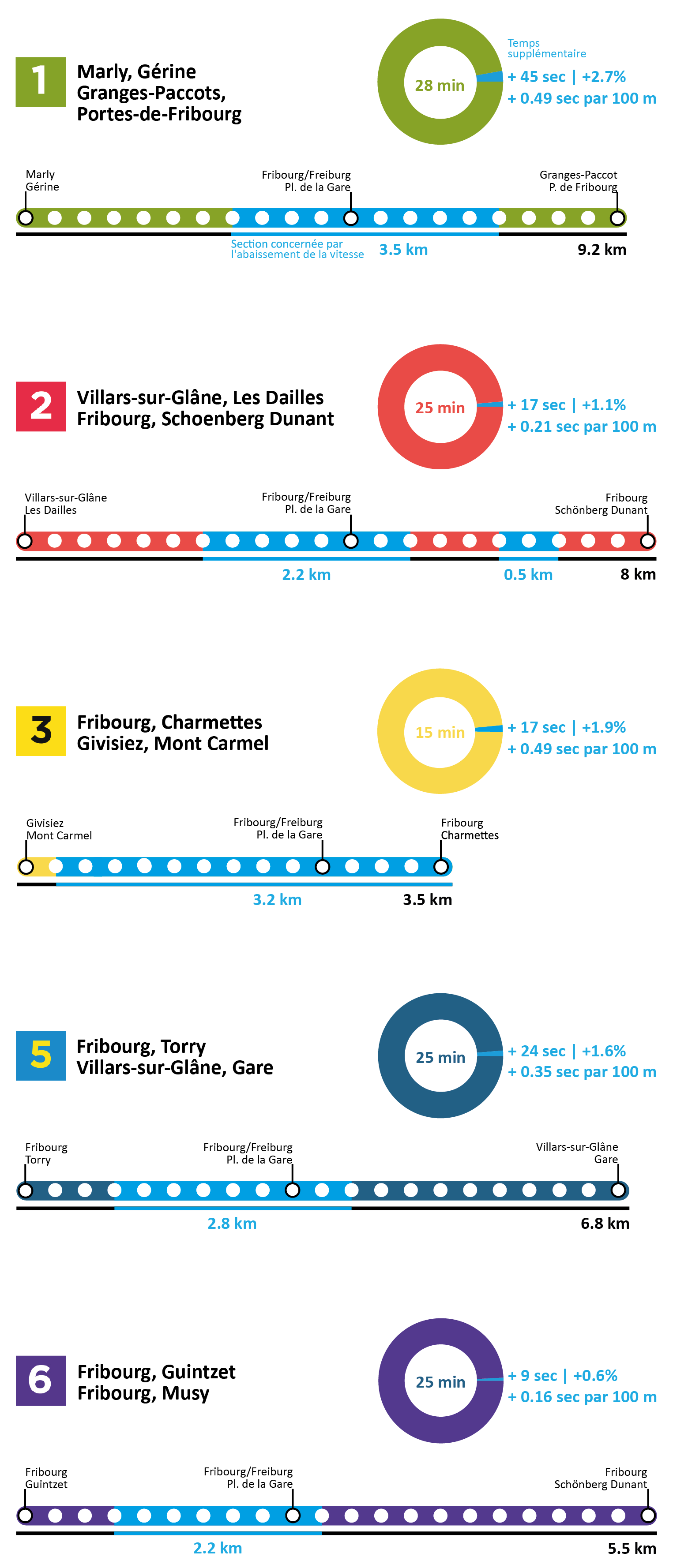Les Transports publics fribourgeois (TPF) ont réalisé une analyse hebdomadaire de la ponctualité des bus sur l’ensemble des lignes de l’Agglo entre le 2 octobre et la mi-novembre 2023. La réduction de la vitesse à 30 km/h a un impact très limité sur les lignes de bus, entraînant une légère augmentation du temps de parcours. Toutefois, cette augmentation reste minime et a pu être absorbée dans l’organisation actuelle des horaires. Aucun véhicule supplémentaire n'a dû être injecté pour compenser ces changements.