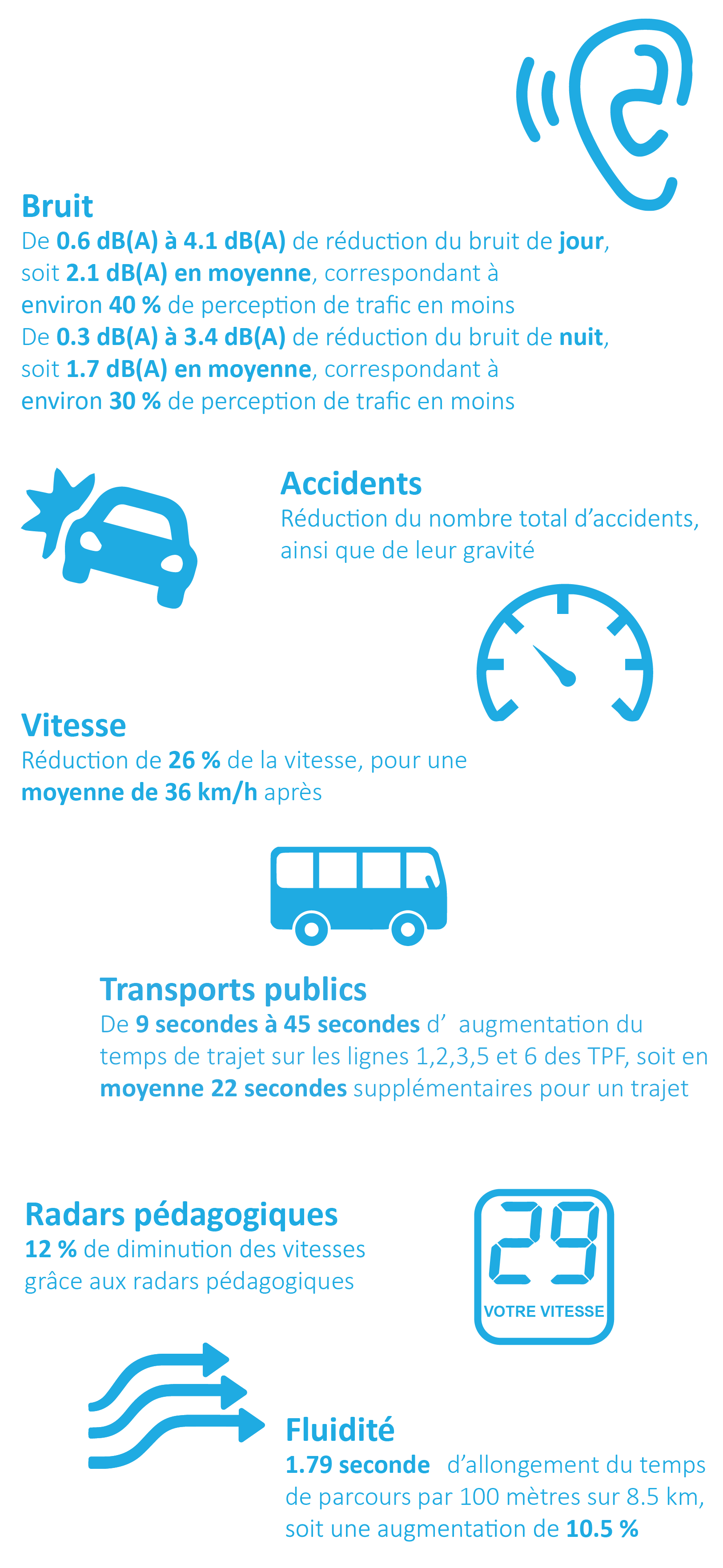 Après plus d’un an d’application, les résultats observés en pratique sont présentés sur cette page : impacts sur le bruit, la sécurité routière, le trafic ou encore les transports publics. L’efficacité des radars pédagogiques installés pour faire respecter les nouvelles limitations est également analysée.