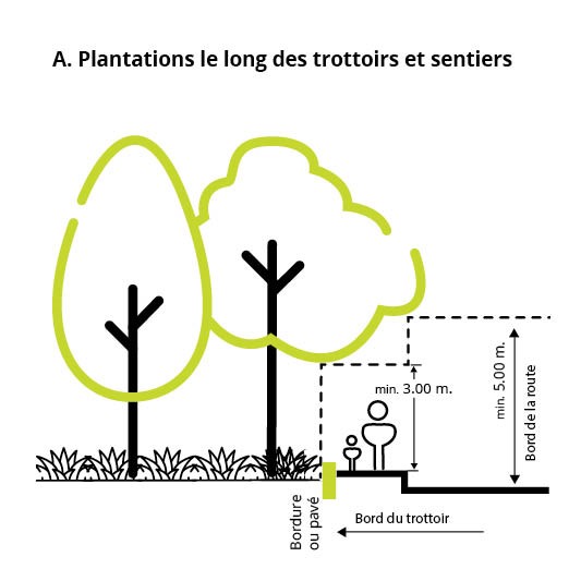 Si des arbres, arbustes ou haies dépassent la limite cadastrale de votre propriété, nous vous prions de les tailler ou faire tailler, et de répéter l’opération autant que nécessaire tout au long de l’année, de manière à laisser un espace libre de 3 mètres au-dessus d’un trottoir ou d’un itinéraire de mobilité douce et de 4,5 mètres au-dessus d’une chaussée.